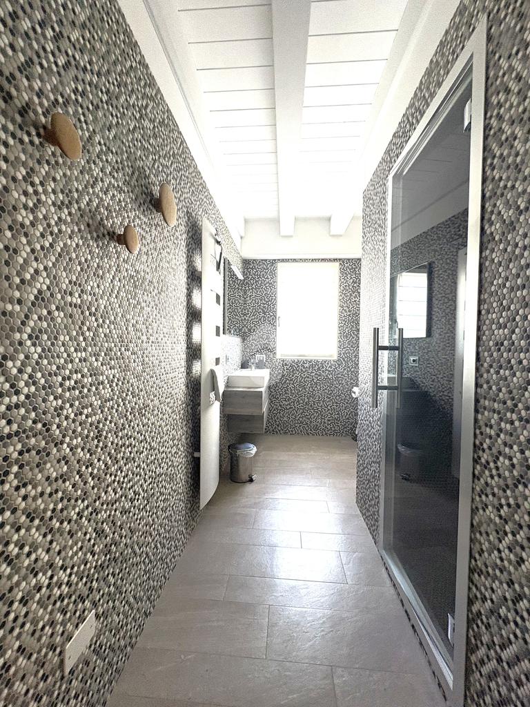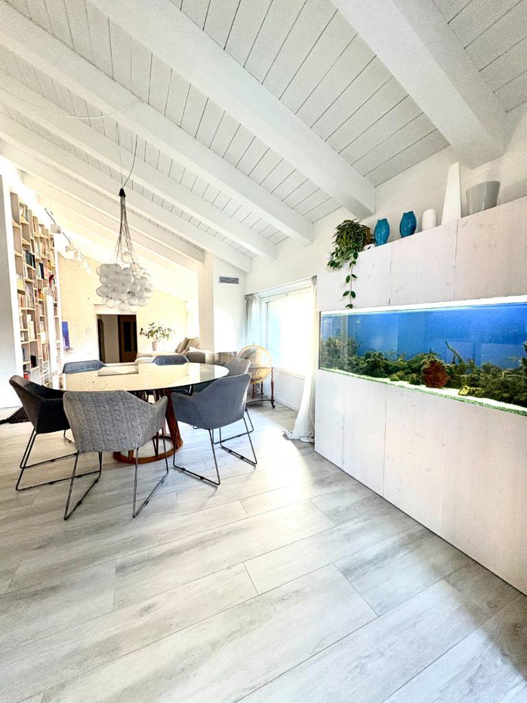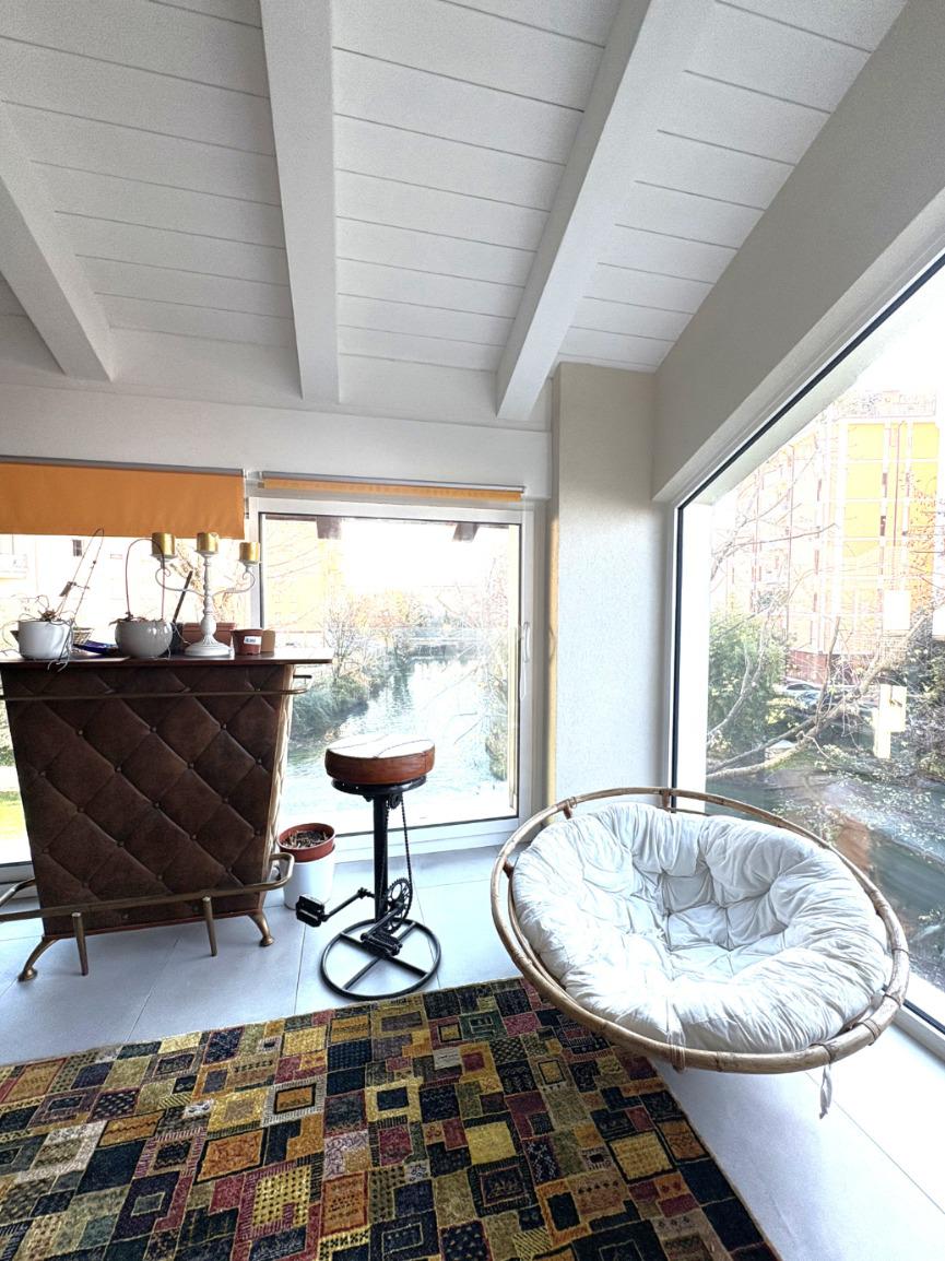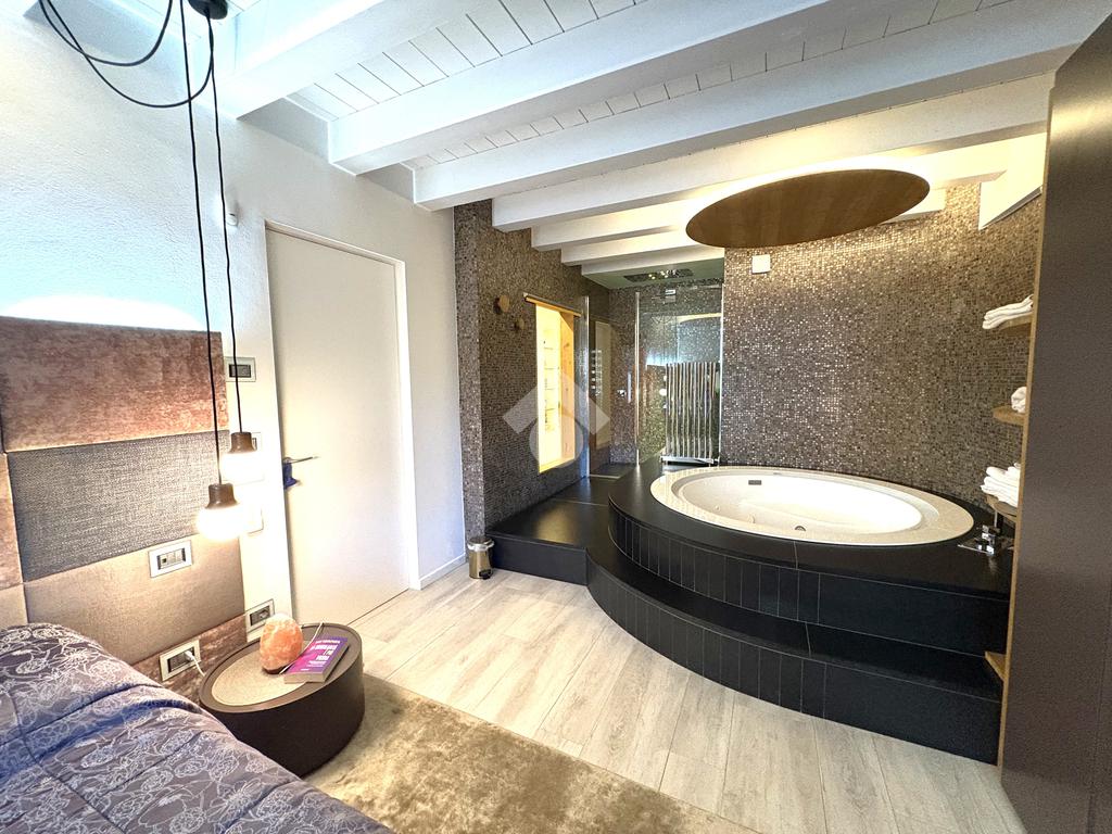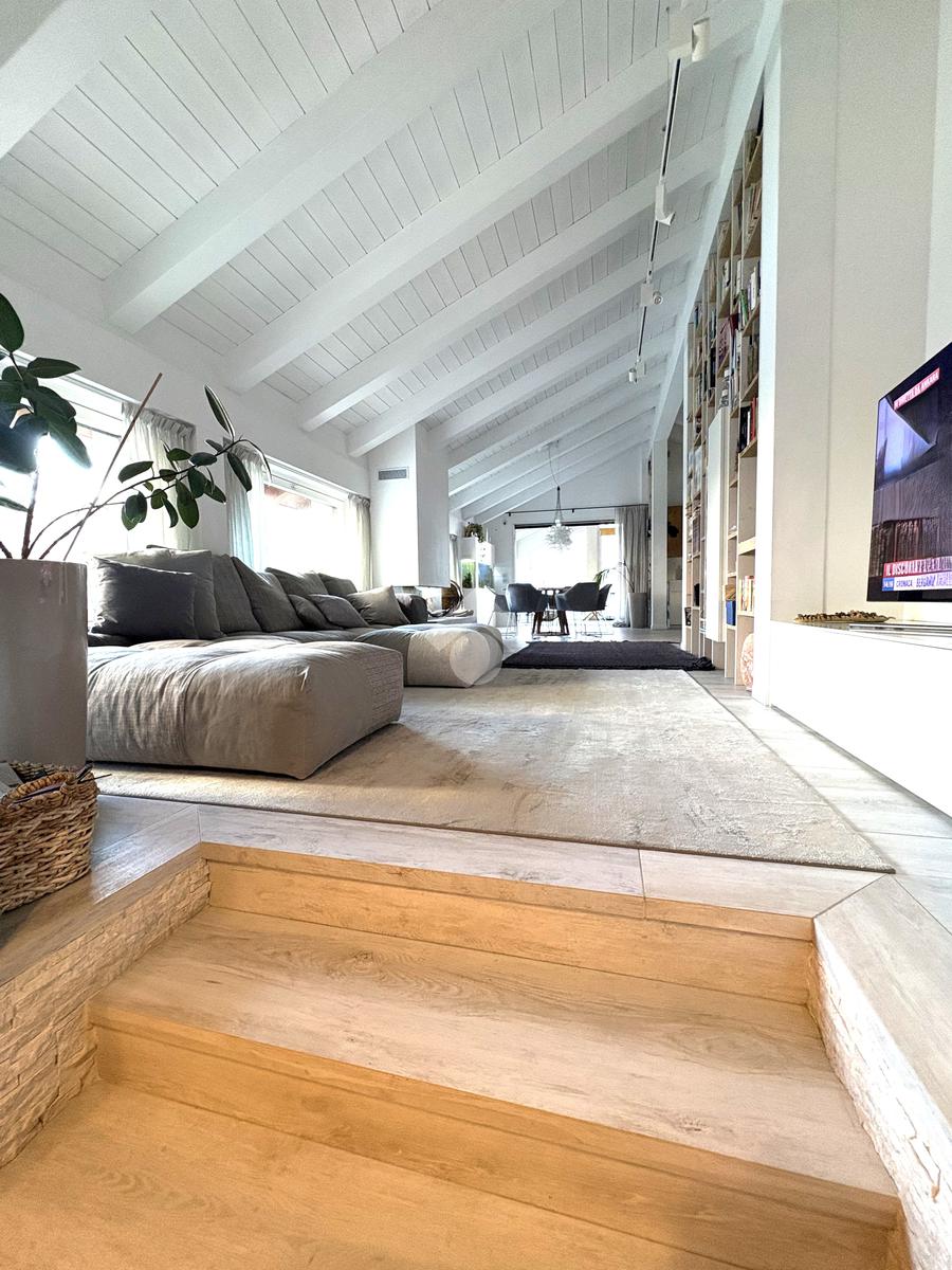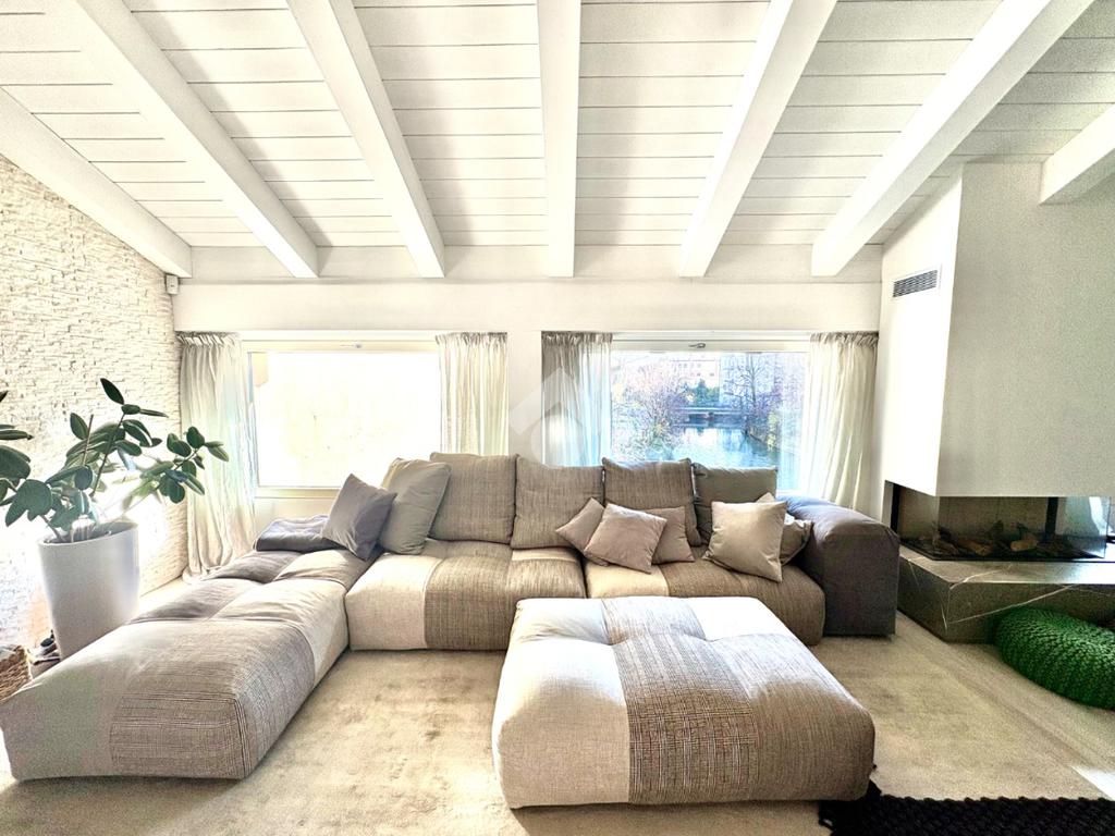 La proprietà presenta ingresso su disimpegno che separa zona giorno e zona notte in due livelli sfalsati; lato sinistro troviamo ampio soggiorno living di circa 60 mq con cucina a vista, camino ed accesso a comoda terrazza di circa 30 mq con sauna privata, studiata per un profondo benessere dopo una lunga giornata intensa godendo inoltre della gradevole vista sul fiume, camera studio e bagno di servizio, proseguendo, troviamo le camere da letto di cui una matrimoniale di oltre 18 mq con vasca idromassaggio interna, doccia cromoterapia e terrazza di pertinenza, 2 camere doppie e bagno padronale con cabina doccia doppia seduta interna per un totale relax, locale caldaia ad uso ripostiglio.