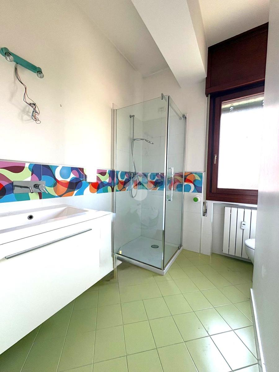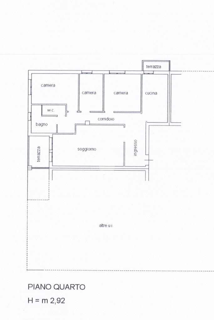 La soluzione presenta ingresso su ampio disimpegno, soggiorno separato con comodo ripostiglio ed accesso a terrazza abitabile e cucina con altro terrazzino di pertinenza; proseguendo dal corridoio troviamo camera matrimoniale, camera doppia, camera singola, bagno padronale finestrato con box doccia e bagno di servizio.
